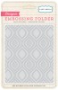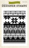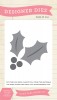 To create the card ink the Fair Isle background stamp with burgundy ink and stamp into burgundy cardstock. Run the kraft cardstock through the manual die cut machine using the embossing folder. Cut into a pennant shape. Mount a scallop border in black on the right side of the banner. Wrap twine around the pennant four to five times and tie into a bow. Mount the banner on the card. Die the holly leaves from green cardstock and mount on the banner. Add gold sequins for the "berries." Die cut the word "merry" from white cardstock and mount on the card.